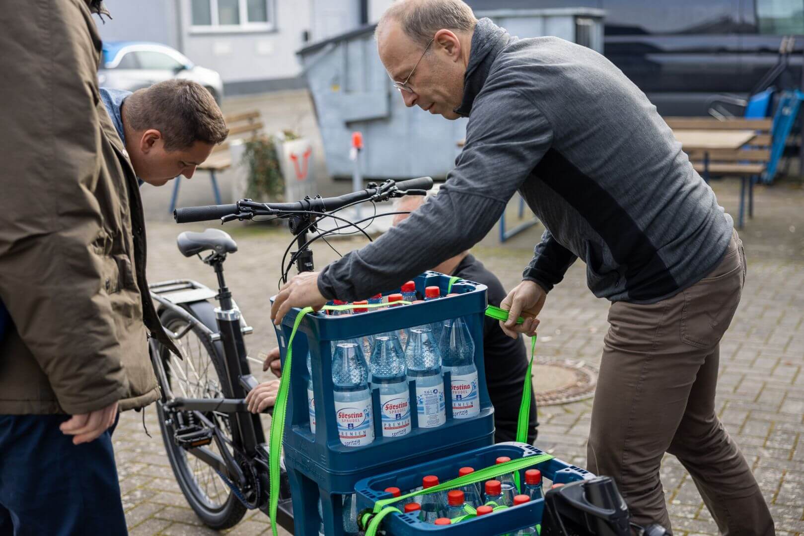 Die erste Fahrt mit drei Wasserkisten lief gut...wir wollten keine Bierkisten nehmen. Das Risiko war uns zu groß. Wenn das Rad nicht gehalten hätte, dann wären womöglich ein paar Flaschen zu Bruch gegangen.